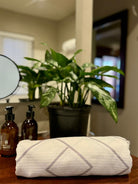 Made from premium “waffle weave” microfibre, they are slightly thicker than our “sueded” microfibre beach towels, offering that super soft “plush” feel that we all know and love after a shower!