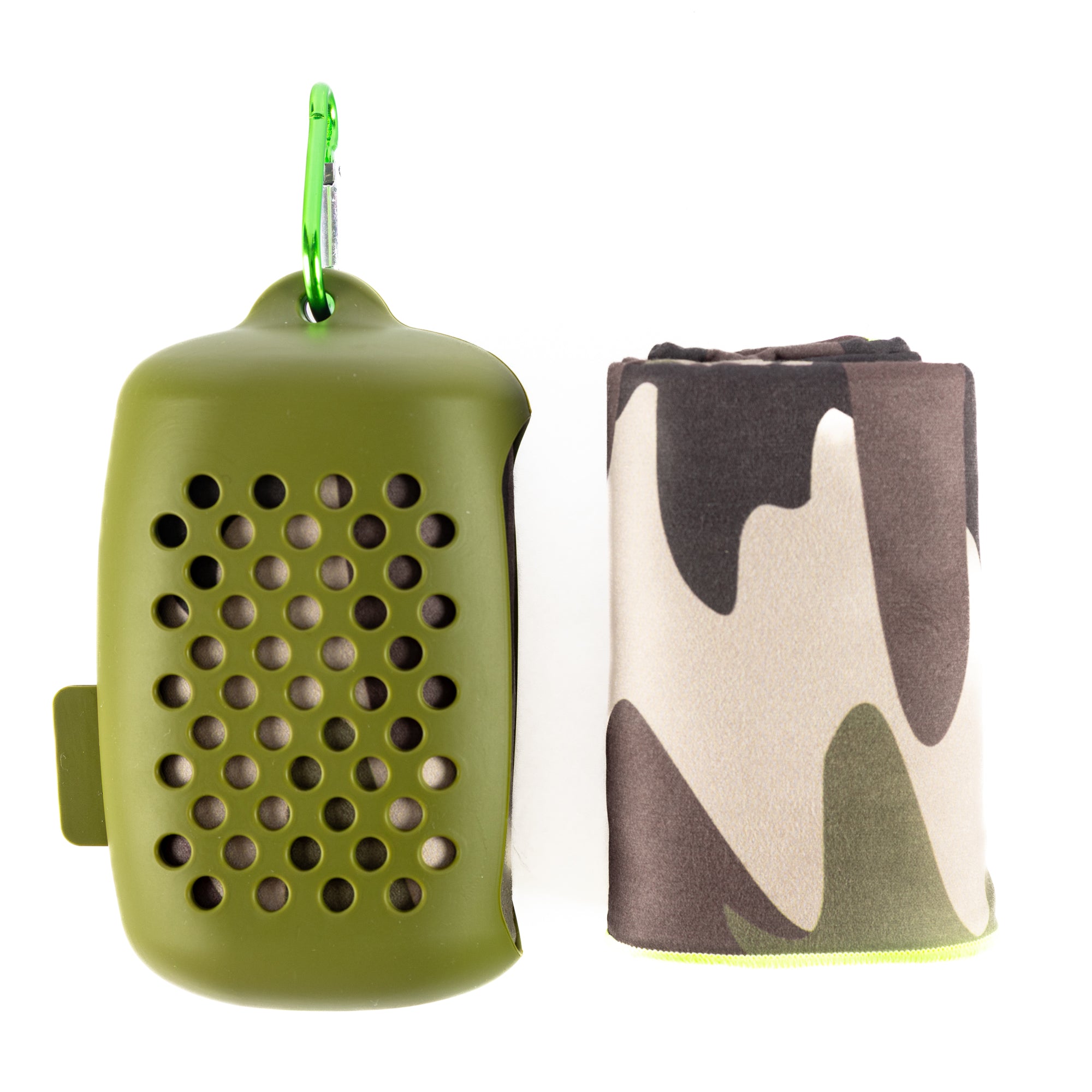 - Easy to clean and use silicone container - perfect to carry the towel around while clipped to a bag / backpack