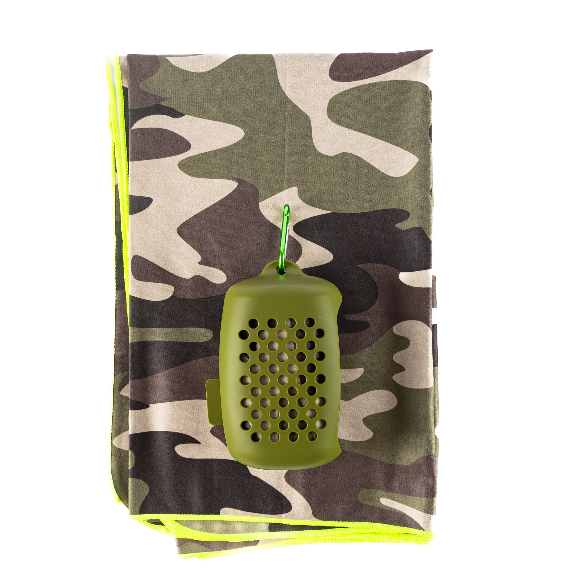 Silicone container with an attachable clip and a printed towel size 80 x 100cm - perfect to dry you where needed!