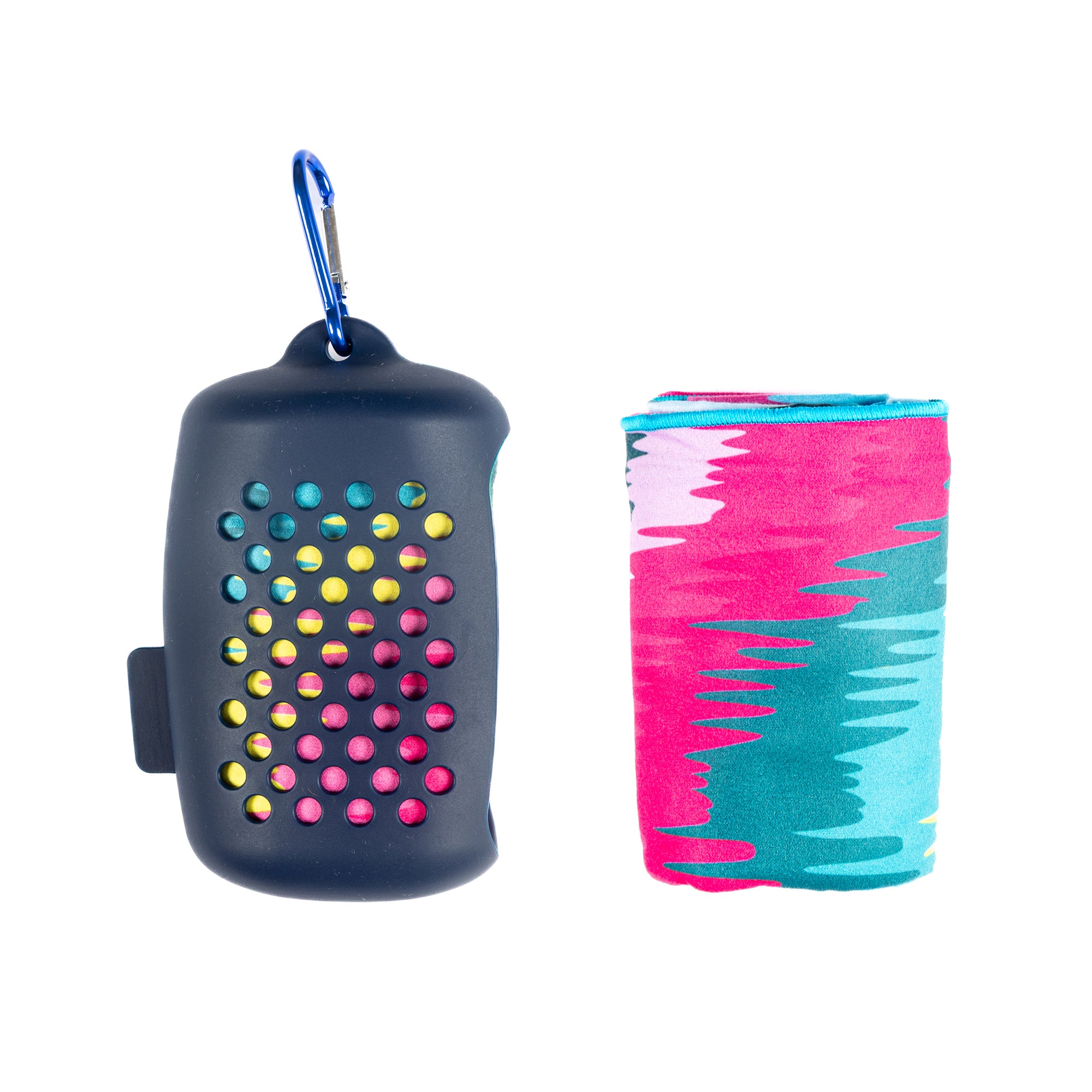 NEW NEW NEW!!! The perfect accessory for being - on the move! - BOBUMS CONVO PACK Silicone container with an attachable clip and a printed towel size 80 x 100cm - perfect to dry you where needed! Compact design - very compact, lightweight and easy to carry microfibre towel Machine washable - does not tear - resistant to repeated washing Quick drying - microfibre dries very quickly after use Absorption - very effective in drying the body due to its high absorption properties Composition - main fabric 88% polyester / 12% polyamide Easy to clean and use silicone container - perfect to carry the towel around while clipped to a bag / backpack Towels are 100% recycled.