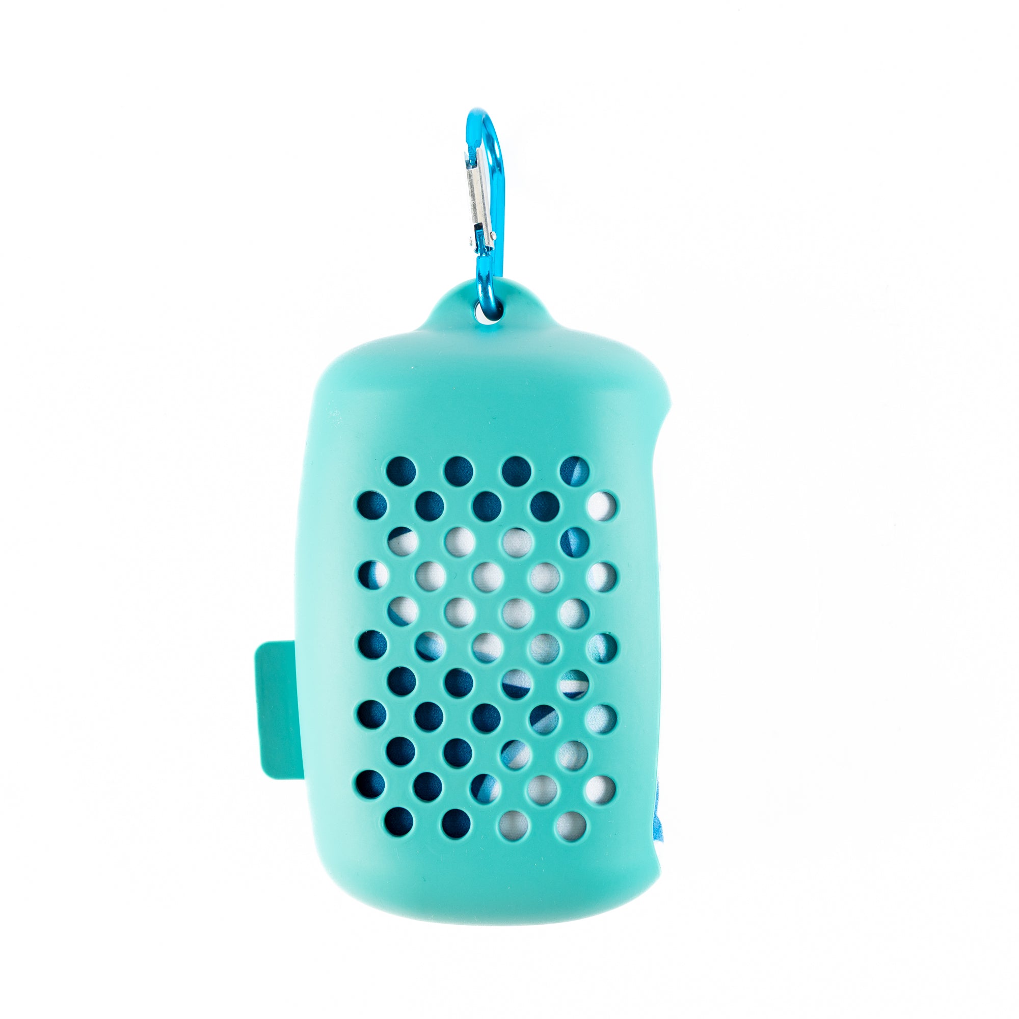 Silicone container with an attachable clip and a printed towel size 80 x 100cm - perfect to dry you where needed!
