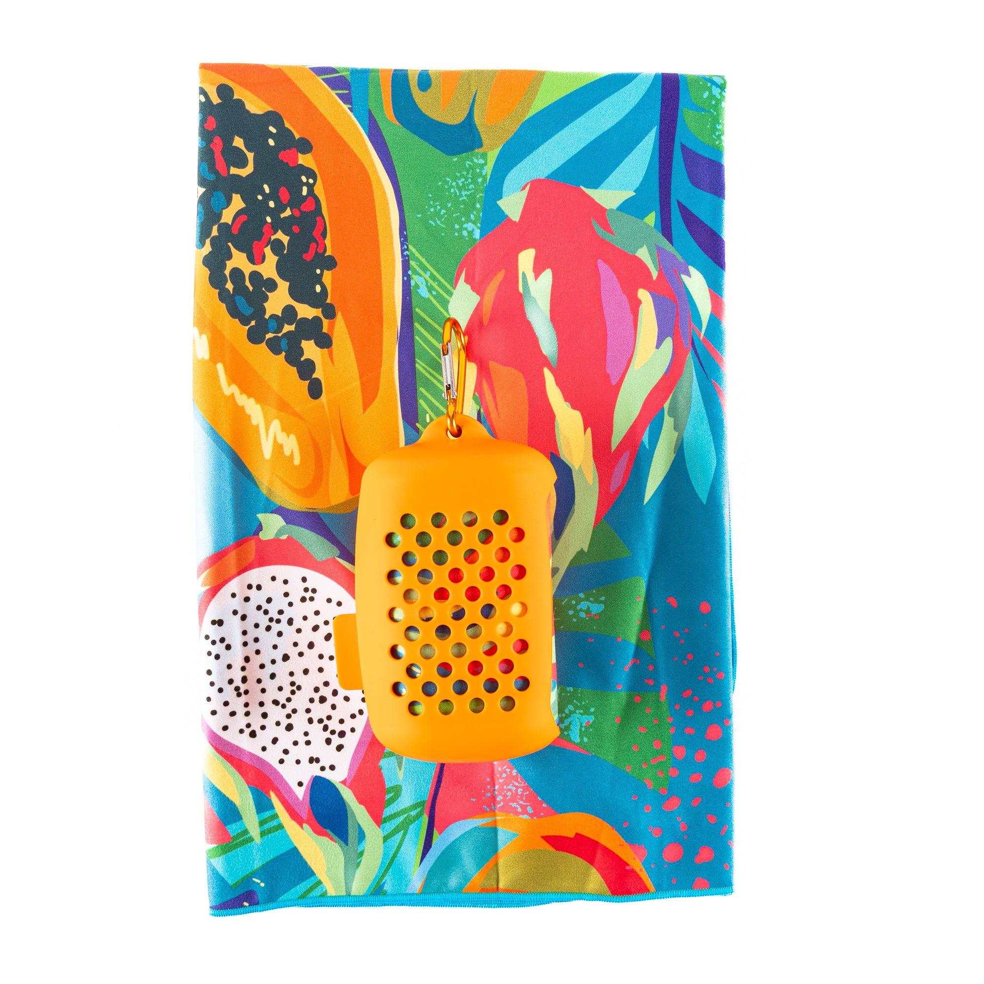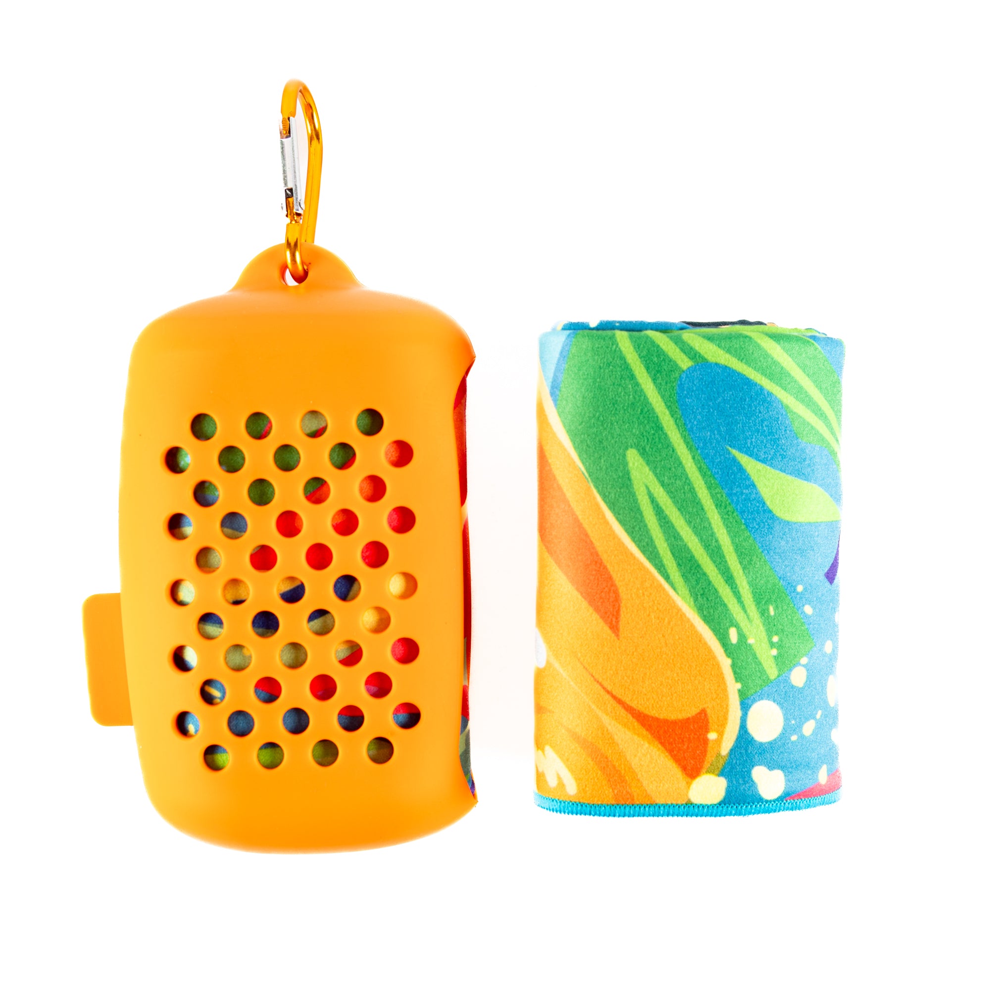 Silicone container with an attachable clip and a printed towel size 80 x 100cm - perfect to dry you where needed!