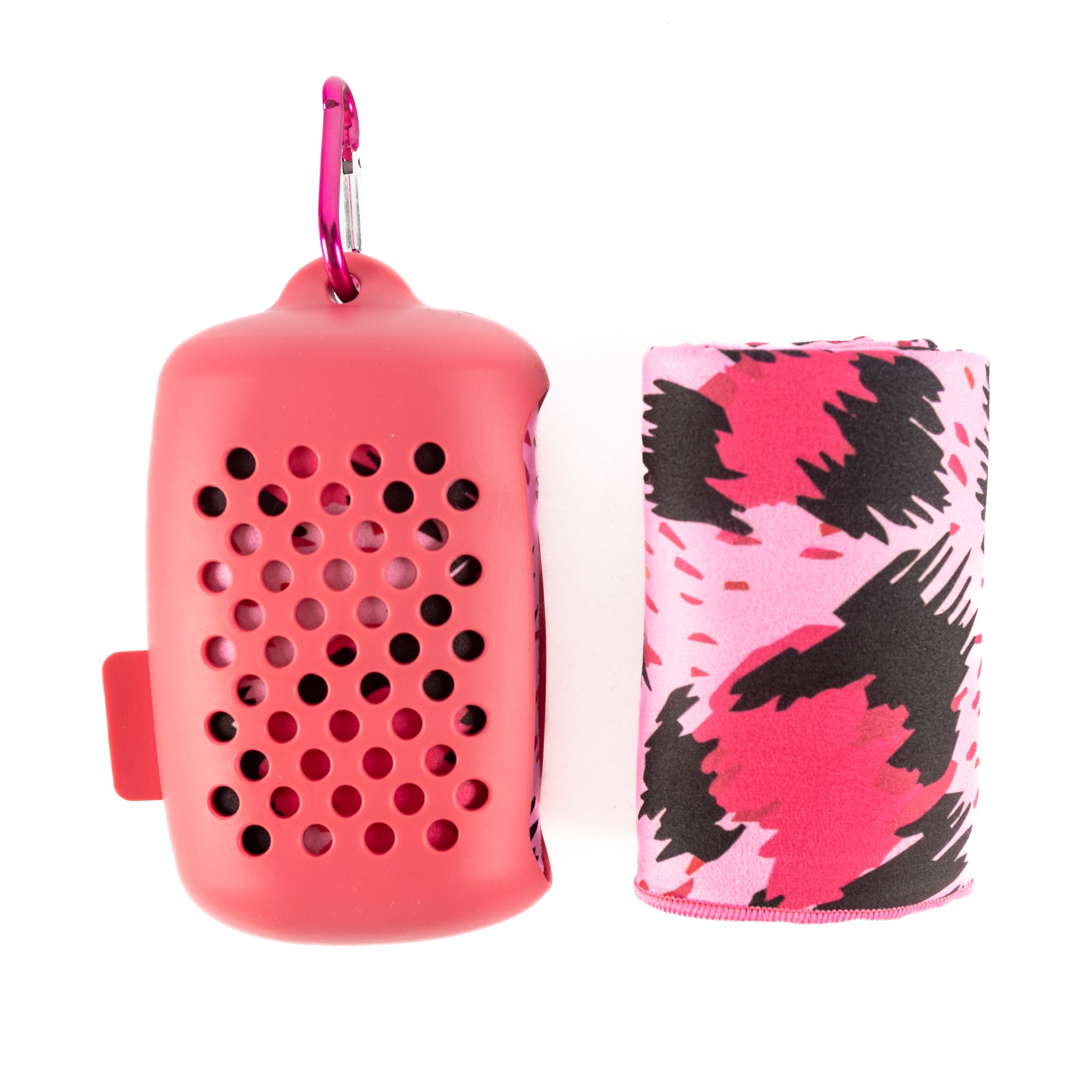 - Easy to clean and use silicone container - perfect to carry the towel around while clipped to a bag / backpack