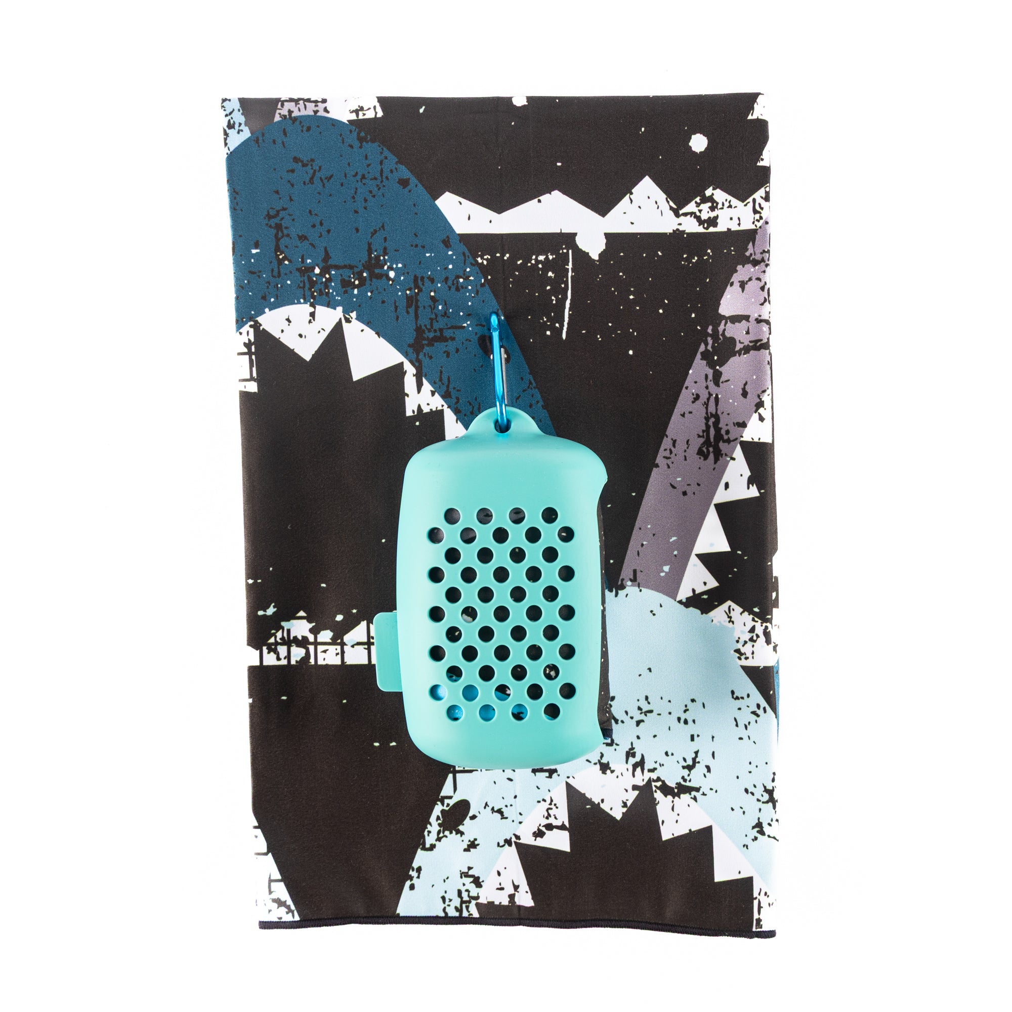 Silicone container with an attachable clip and a printed towel size 80 x 100cm - perfect to dry you where needed!
